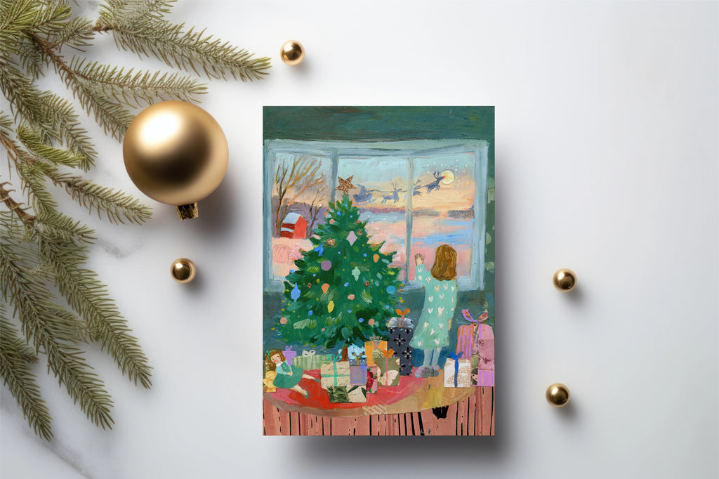 Holiday card bundle of 5 greeting cards featuring my new holiday card design for 2025, "Must Be Santa." Each card set comes with 5 matching white envelopes. The painting features little girl look out her window and waving to Santa as he rides his sleigh through Christmas morning sunrise. Makes an adorable framed holiday image, too (though frame is not included)