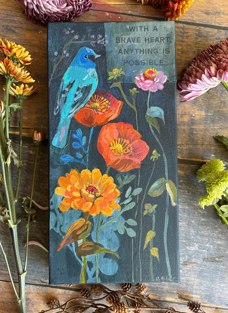 The Indigo Bunting is often seen as a messenger of change and good fortune. Its vivid blue feathers are linked to clarity, inspiration, and finding one’s voice. As a migratory bird, it reminds us that transformation often comes through movement and trust in the journey. Surrounded by bright orange poppies and zinnias, symbolic of creativity and vibrancy, she carries the message inscribed on the painting: “With a brave heart, anything is possible.”
