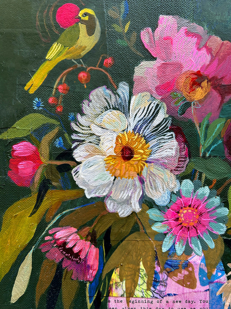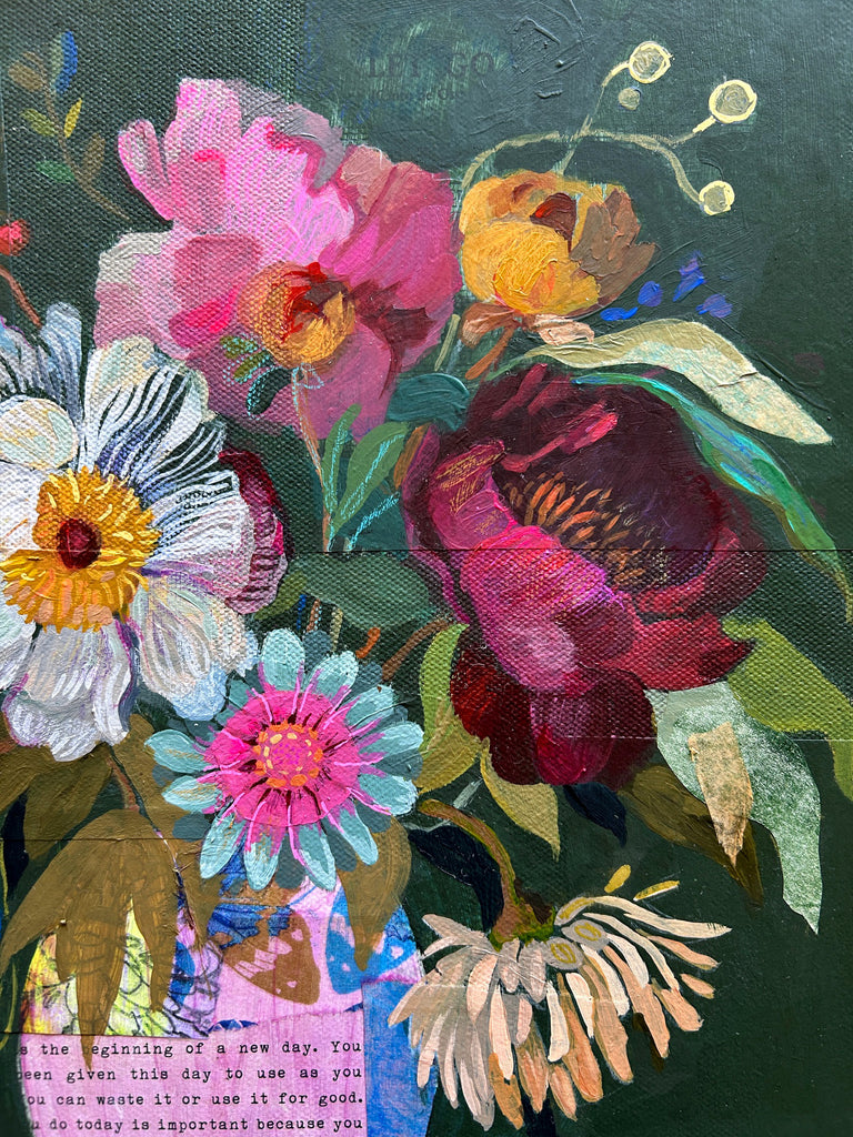 This bouquet of vibrant peonies, (with a few gerbera daisies and asters tucked in) features the lyrics to the song "Let Go" layered beneath the teal green background - and you can still see the words peeking through at the top. As I painted this piece, I thought about how it feels to let go of what no longer serves us and how that can invite warm sunshine and fresh beauty into our lives.