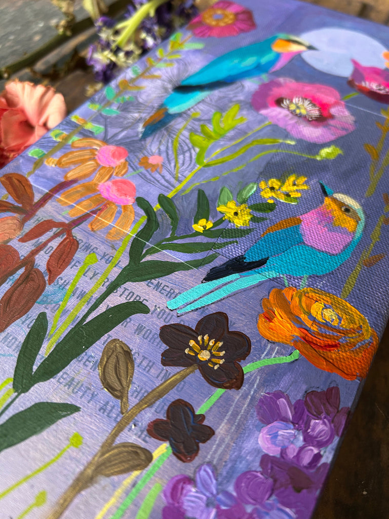 The Lilac-Breasted Roller is celebrated worldwide for is beautiful lilac, turquoise and orange feathers. When seen in pairs, these birds symbolize companionship, support, and the kind of relationships that help us grow into the fullest expression of ourselves. In this painting, two rollers rest among poppies, zinnias, and wildflowers. Together, they remind us that we often shine a little brighter in the company of those who truly see us.