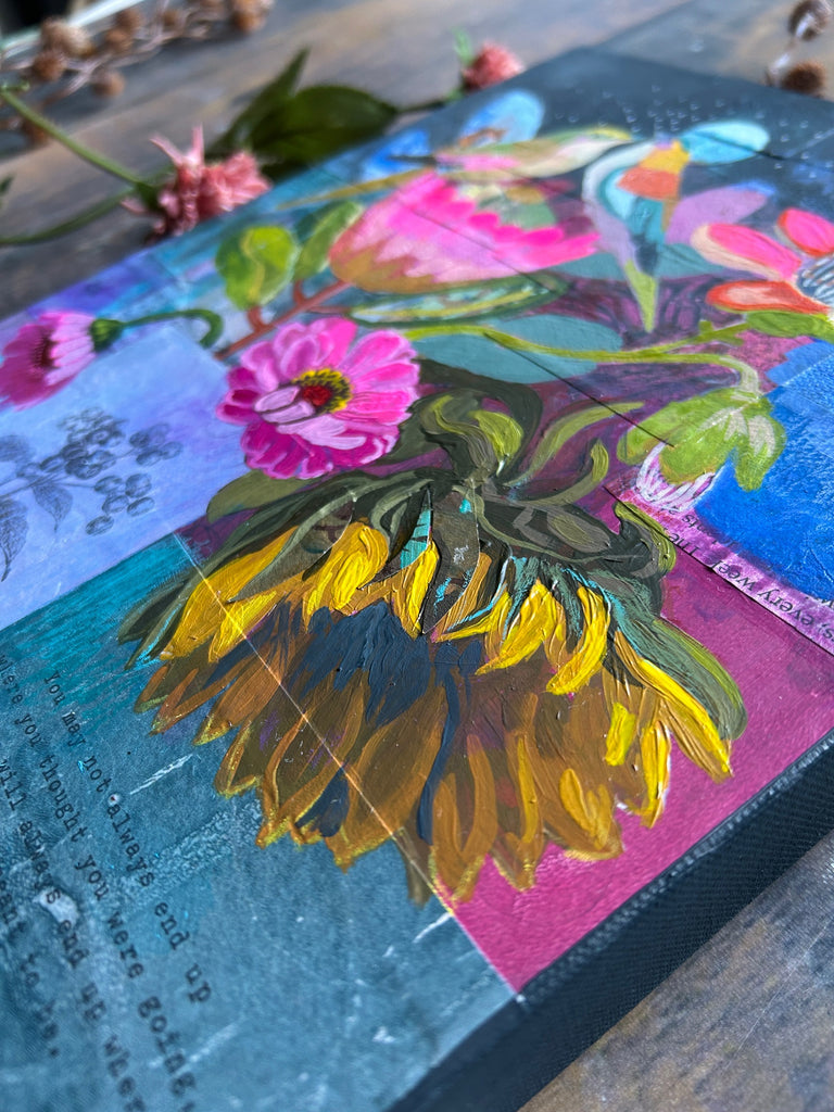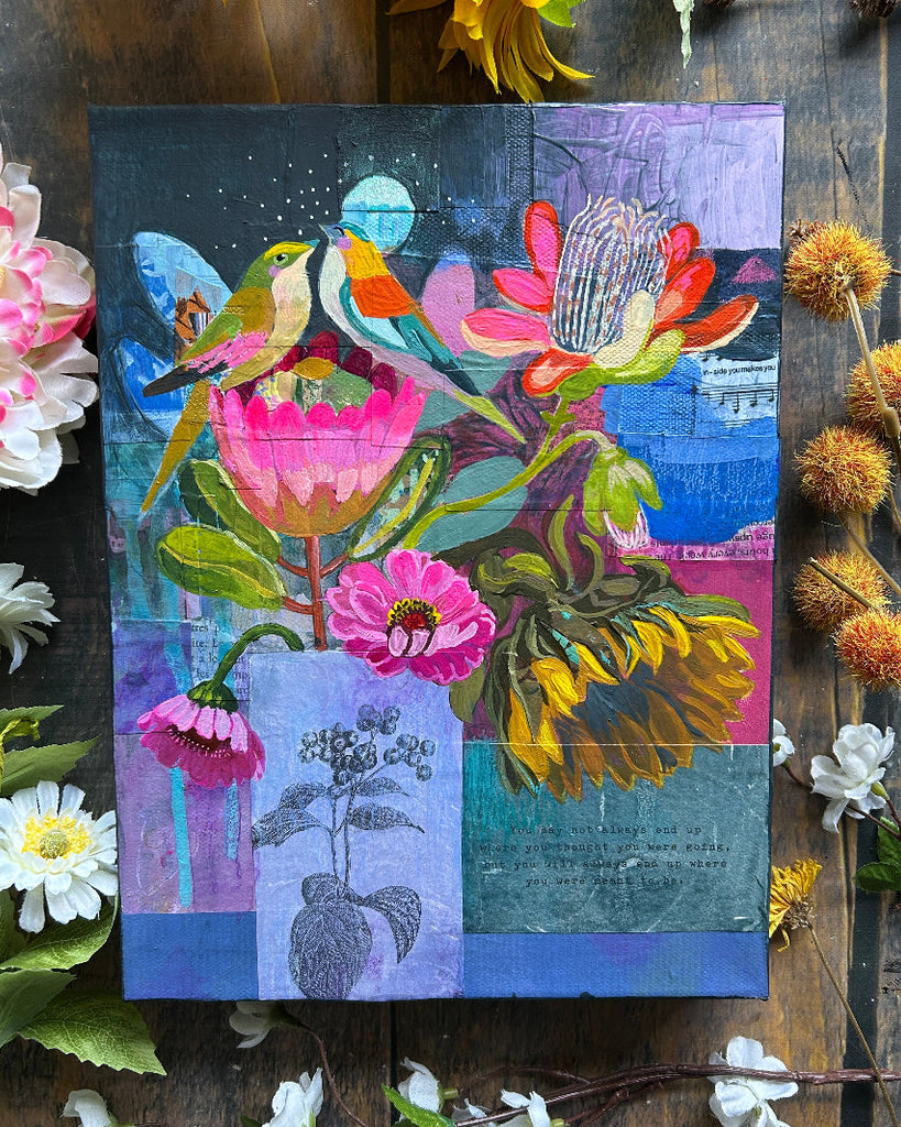 This painting is a continuation of the story of two lovebirds I began with "I Love Our Little World." I created it very intuitively and allowed myself to be guided by the quote on the bottom right which reads: