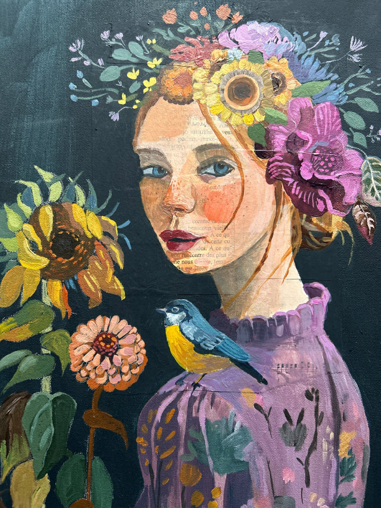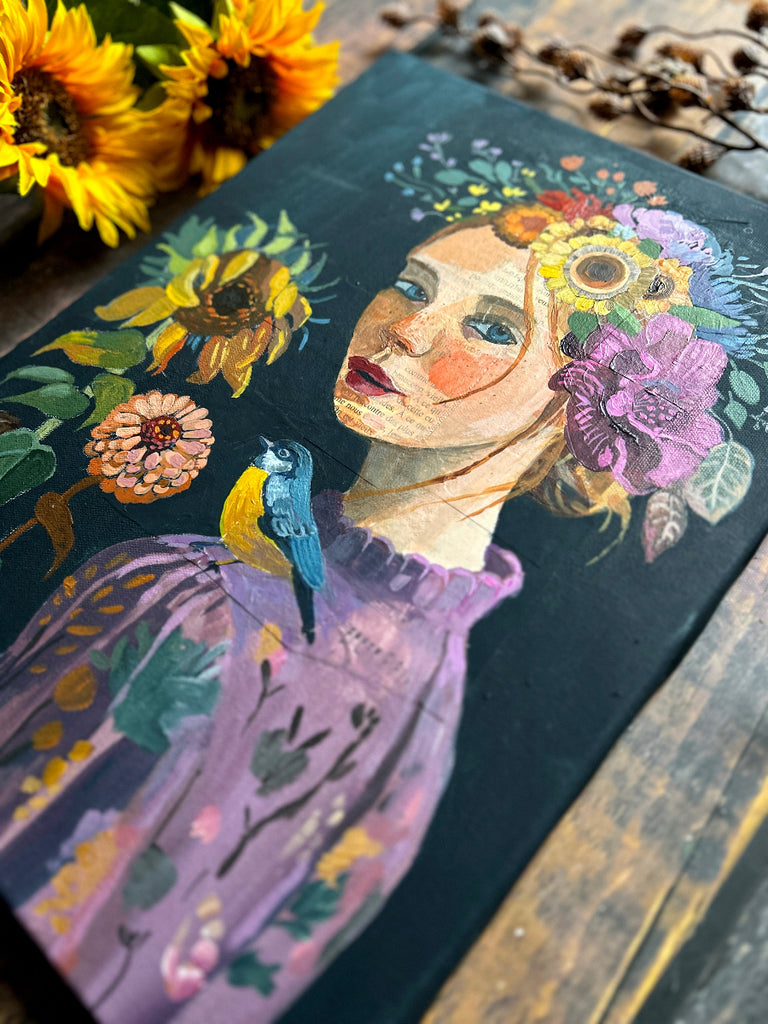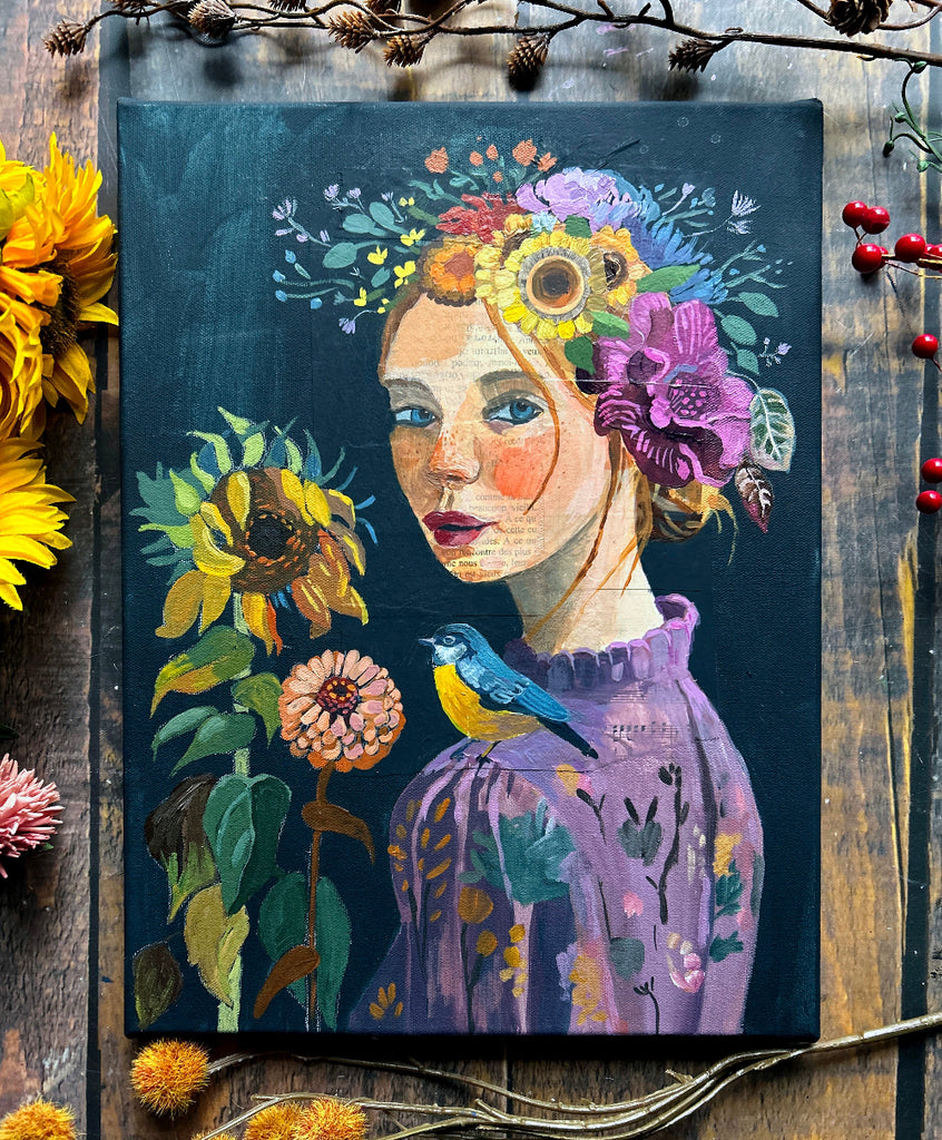 This painting is part of my series on autumn blooms and features a young woman with her hair tucked into a crown of fall flowers and leaves surrounded by sunflowers and zinnias. A little goldfinch friend is perched on her shoulder. This painting is truly luminous in person!