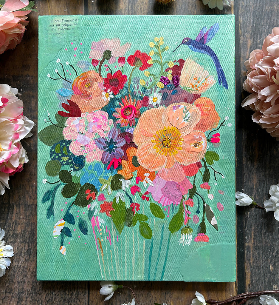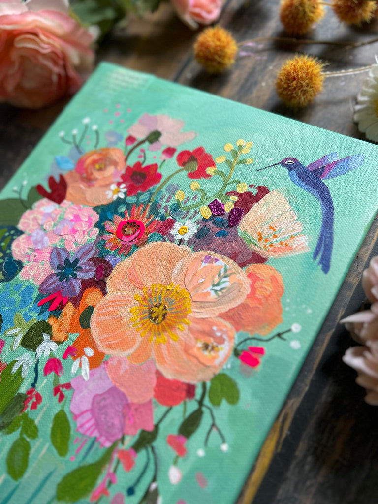 I ended up painting this piece as my son was playing piano (quite loudly!) in the background. At first, I was about to get up and tell him to play more quietly, but then I started to feel inspired by the joy that he was letting flow into the music. So I kept creating, too. And I allowed intuition to guide my way, building each bloom up and using only 3 hues of paint to hand-mix all of the colors in my bouquet.