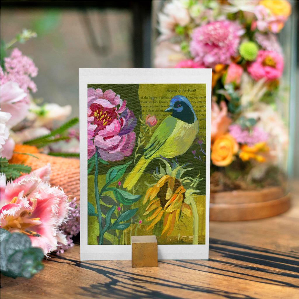 Greeting card bundle of 7 individually packaged greeting cards featuring each of the birds from my "Rainbow of Birds" painting collection (Cardinal, Orange Tanager, Goldfinch, Green Jay, Indigo Bunting, Purple Martin, Lilac-breasted Roller).  Each bundle contains each of the 7 birds as well as matching white envelopes. Cards measure 4.25 x 5.5 inches.